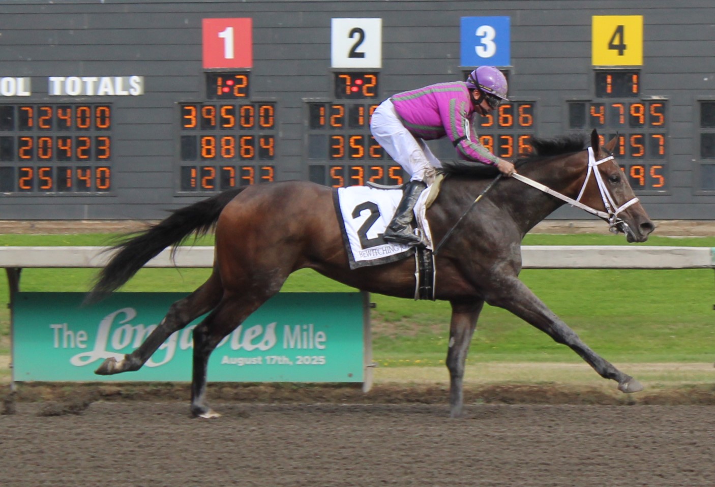 Bewitching Joy races for Cinco Vino Stables. Trainer Frank Lucarelli was clearly pleased with the run of his young filly. “She’s smart and I knew she had this ability. Also thought maybe the distance might impact Tom’s horse, at least I was hoping so.”