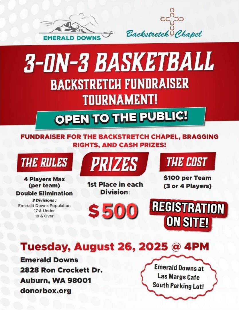 (Auburn, Wa) Tuesday afternoon there is an open to the public 3 on 3 basketball tournament at Emerald Downs. The baskets will be set up in the Las Margs cafe parking lot and the tournament begins at 4pm. The tournament is a fundraiser for the Backstretch Chapel who help folks who work day after day in the barns caring for the horses. They offer multiple services from medical and health care to child care and spiritual support.