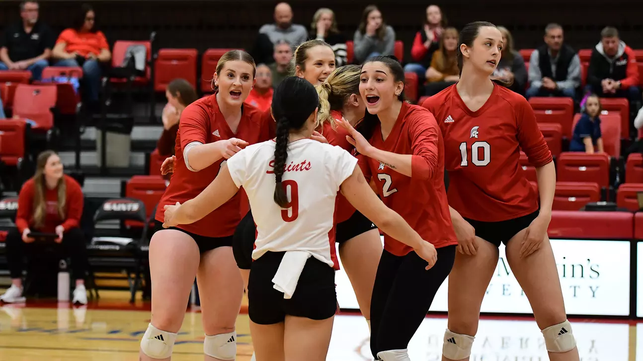 (Lacey, WA) The Saint Martin’s Saints were looking to get back over .500 over Northwest Nazarene, and the match went the distance in a Saturday afternoon thriller. The Saints dropped the opening set 25-20 but recovered to win set two 25-22. Northwest Nazarene narrowly took the third set 25-23, and the Saints took the fourth 25-22, forcing a fifth set. Saint Martin’s trailed 6-2 early in the final set, but a 6-0 run sparked things for the Saints to take the lead. Saint Martin’s closed out the final set, winning 15-11 to get back in the win column. Saint Martin’s now sits 12-11 overall, doubling their win total from last year, and 5-10 in GNAC play, one more win than a year ago. The Saints go on the road next week to Seattle Pacific and Montana State Billings before closing out the season against Western Oregon at home on November 22.