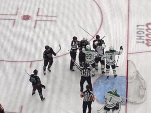 Seattle 49 seconds into the game saw Dallas’s Alexander Petrovic high sticked Jared McCann welcoming him back from injury. McCann about his welcome said, “try to battle for a puck and next thing you know, my tooth is in my throat.” The Kraken could not score off two shots on the ensuing double minor power play. Roope Hintz got the scoring started 5:52 into the game off a tip-in from an Alex Petrovic shot from the right point to put the Stars up 1-0. The lead did not last long.