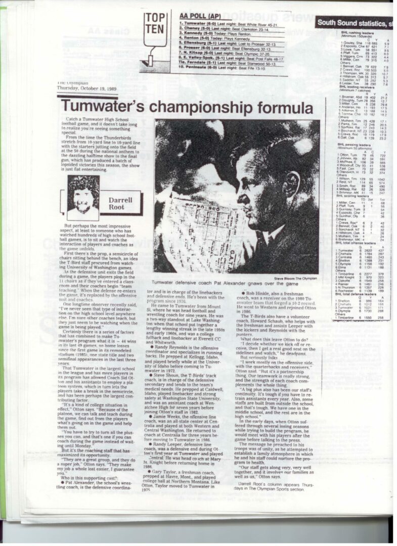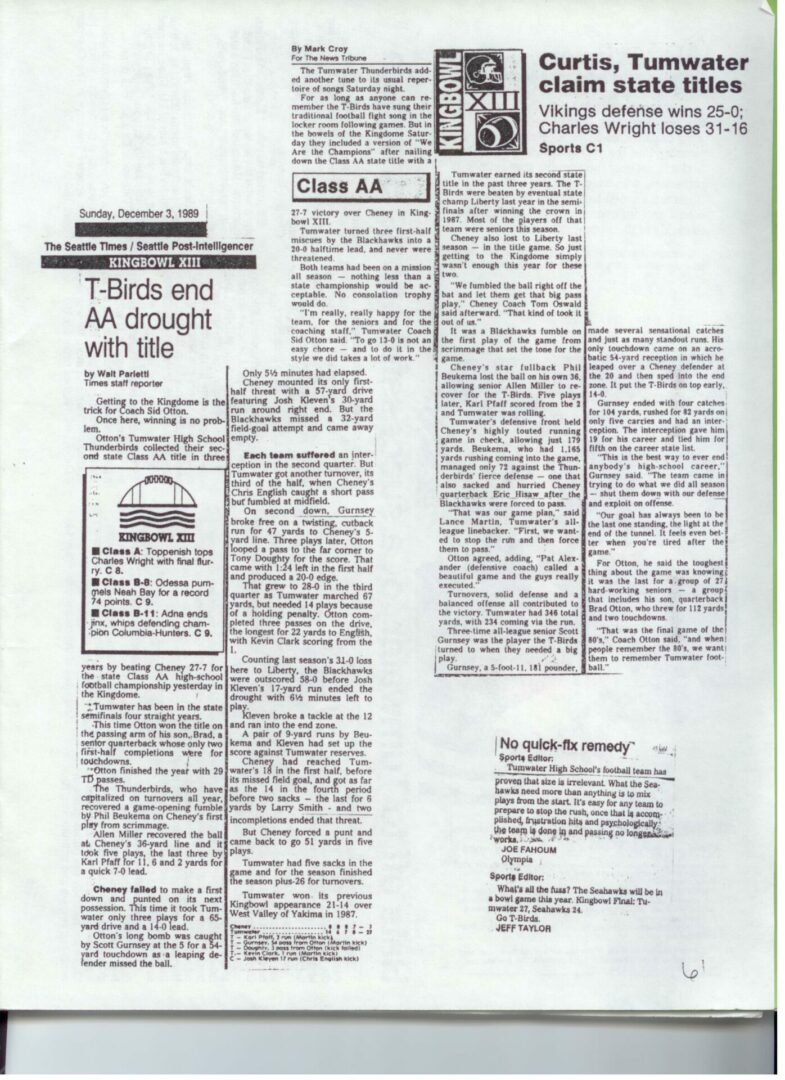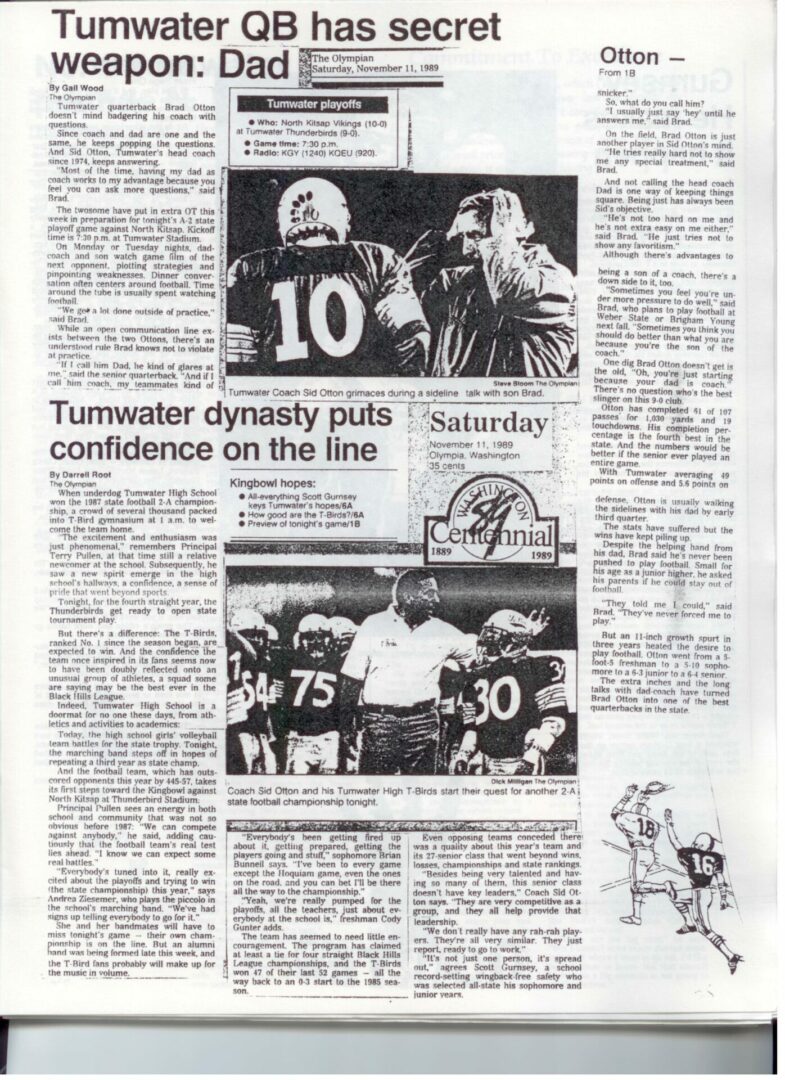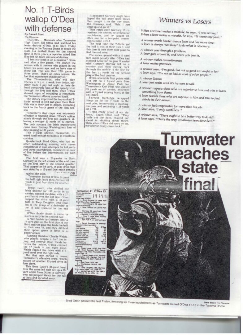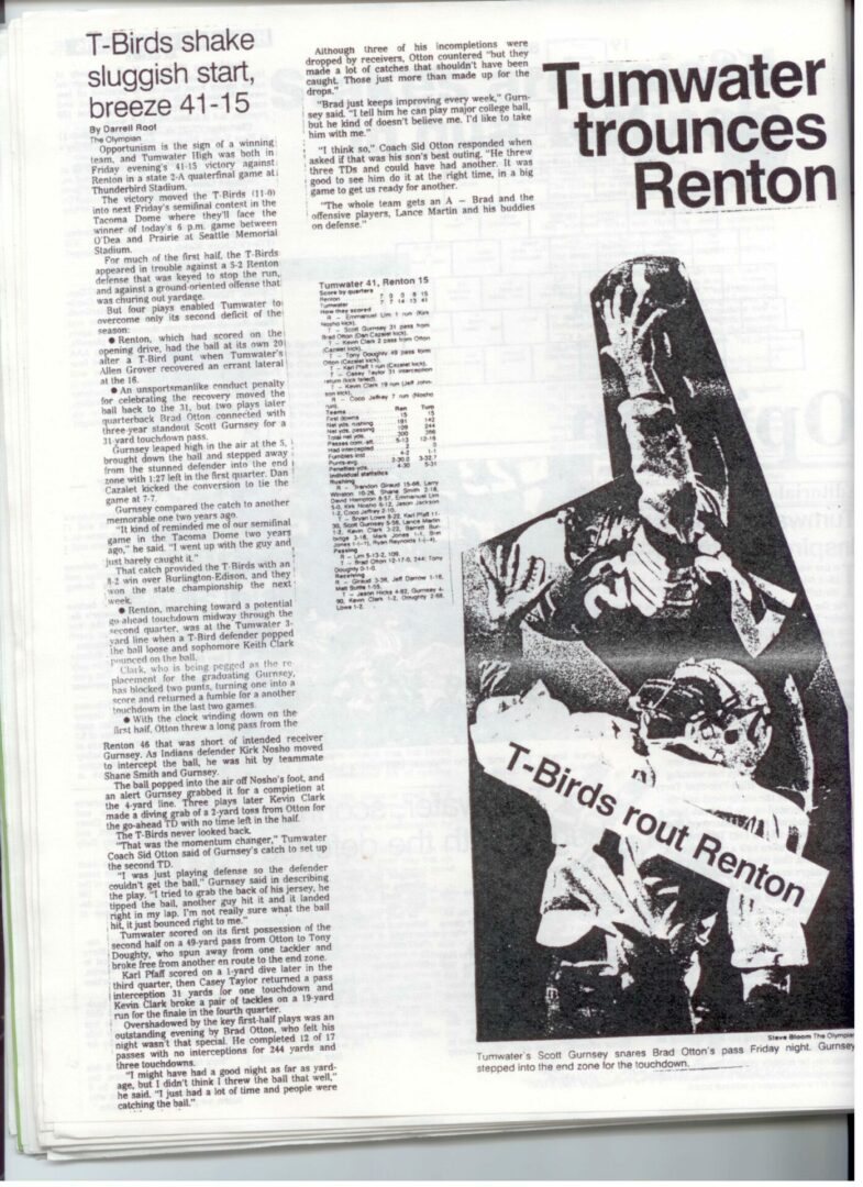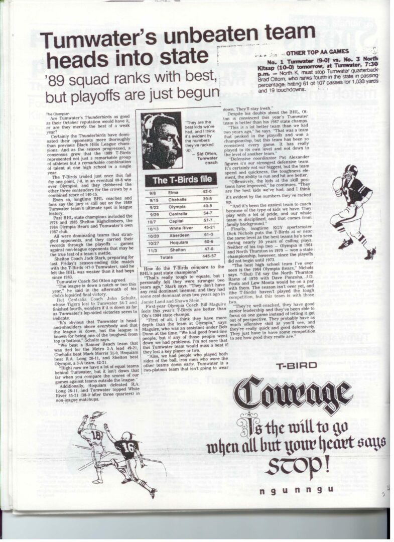 We wrote this to chronicle the amazing journey Coach Otton went on from his early days winning his first State Title in Colfax to starting his career in Tumwater with a 7-20 record and wondering if their would be a 4th season. Now days, highly unlikely. This was one of the reasons we wanted to write this as it took Coach Otton 13 years to win his 1st title as a T-Bird. But the program and culture he created is undeniable and could only have done it with adminsitrative support that refused to give-in to agrieved parents calling for his firing in the early days.