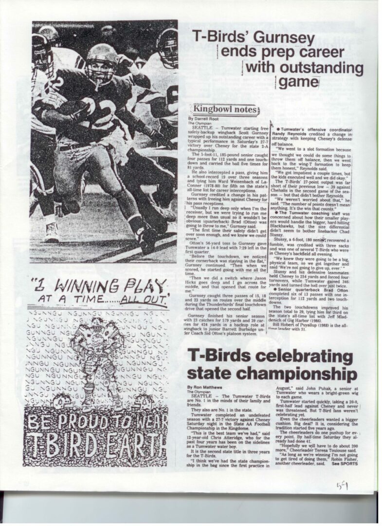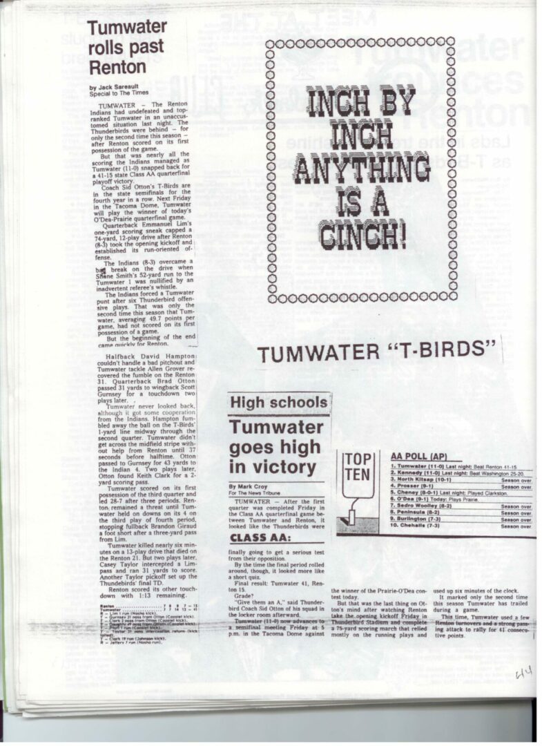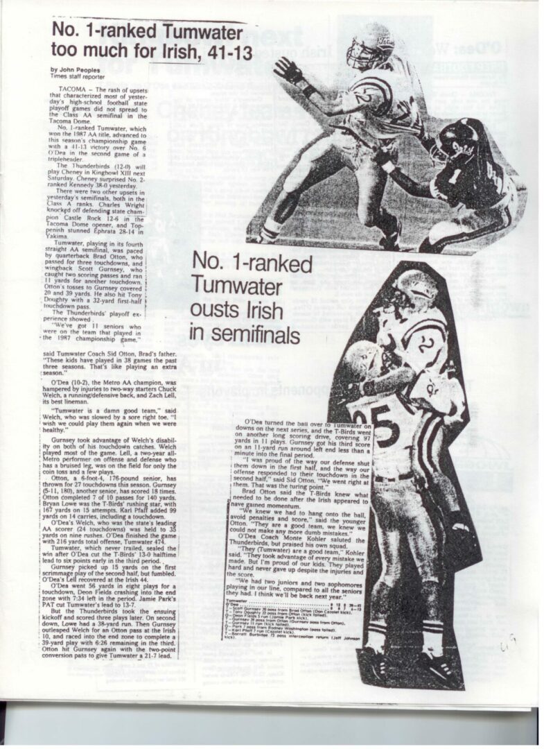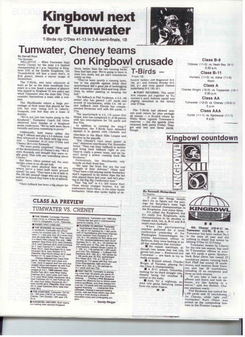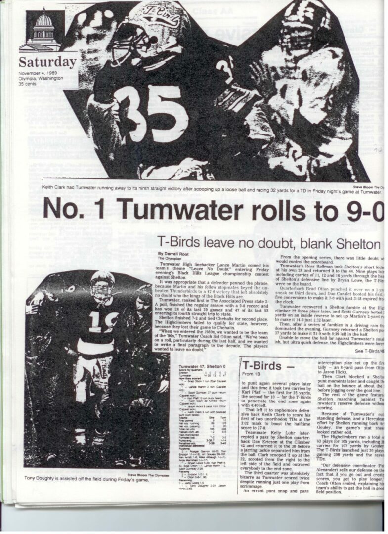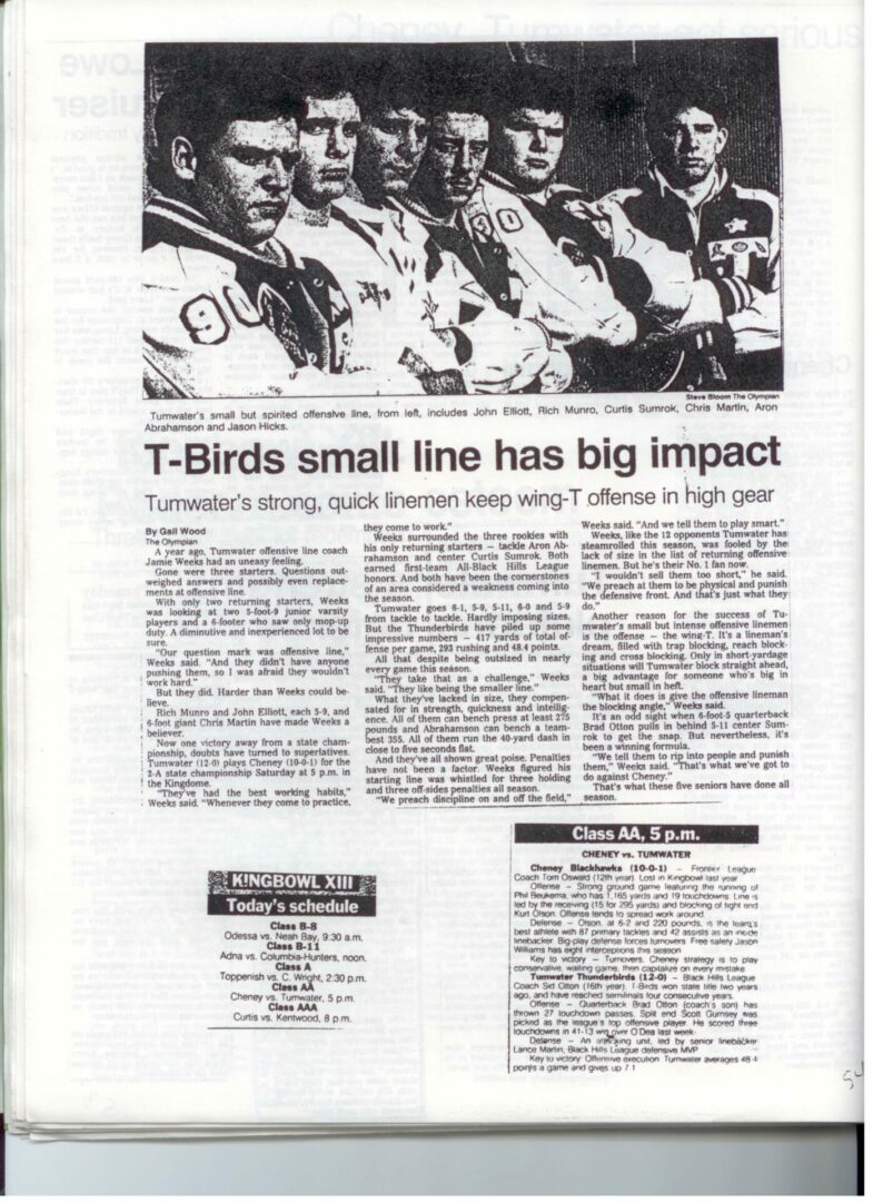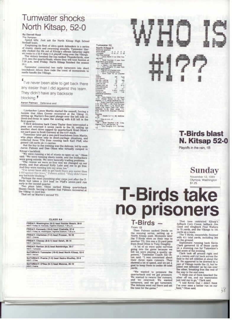 We wrote this to chronicle the amazing journey Coach Otton went on from his early days winning his first State Title in Colfax to starting his career in Tumwater with a 7-20 record and wondering if their would be a 4th season. Now days, highly unlikely. This was one of the reasons we wanted to write this as it took Coach Otton 13 years to win his 1st title as a T-Bird. But the program and culture he created is undeniable and could only have done it with adminsitrative support that refused to give-in to agrieved parents calling for his firing in the early days.