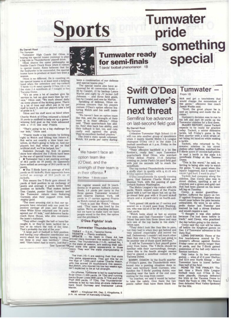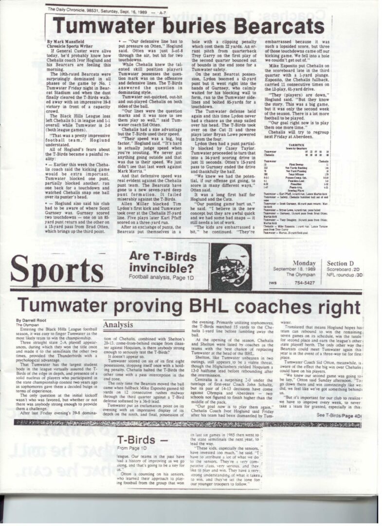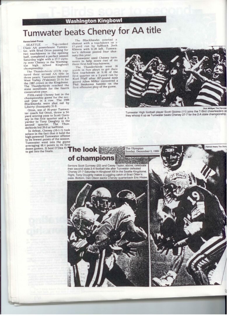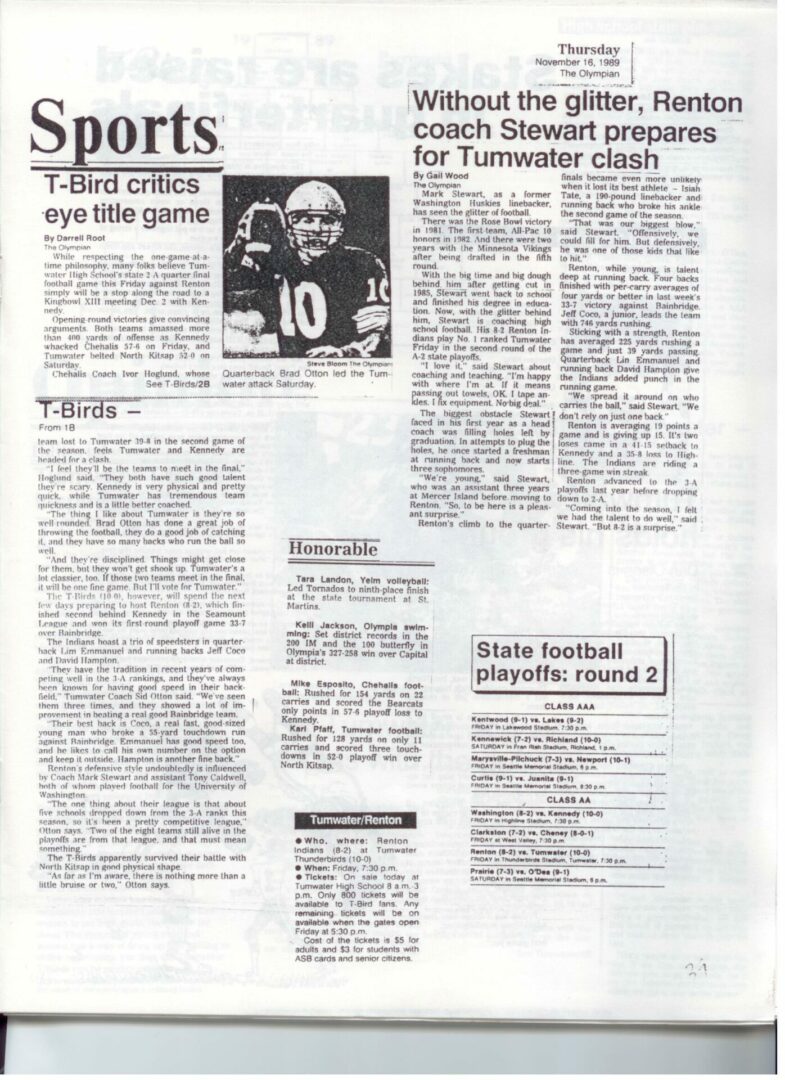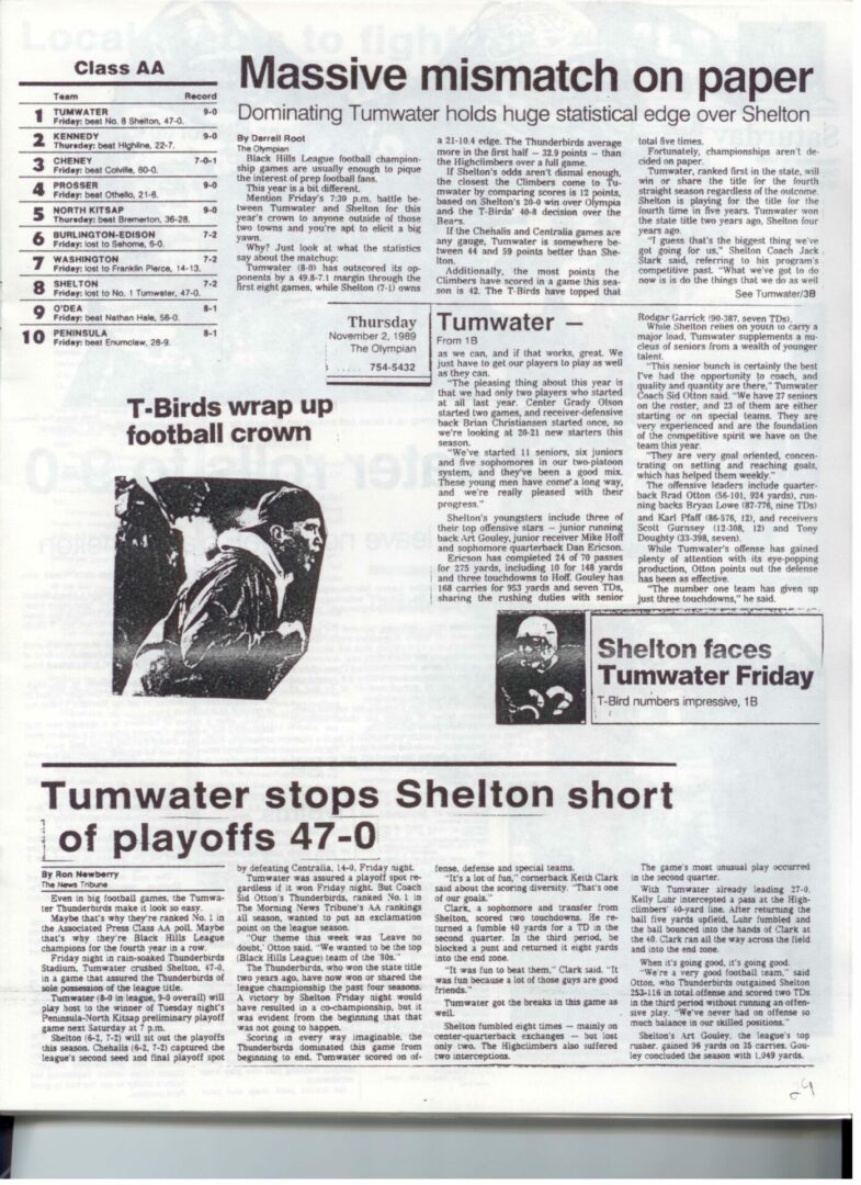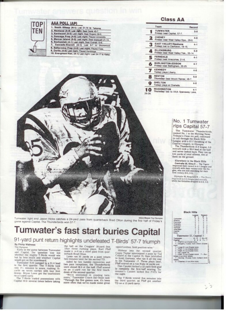 We wrote this to chronicle the amazing journey Coach Otton went on from his early days winning his first State Title in Colfax to starting his career in Tumwater with a 7-20 record and wondering if their would be a 4th season. Now days, highly unlikely. This was one of the reasons we wanted to write this as it took Coach Otton 13 years to win his 1st title as a T-Bird. But the program and culture he created is undeniable and could only have done it with adminsitrative support that refused to give-in to agrieved parents calling for his firing in the early days.